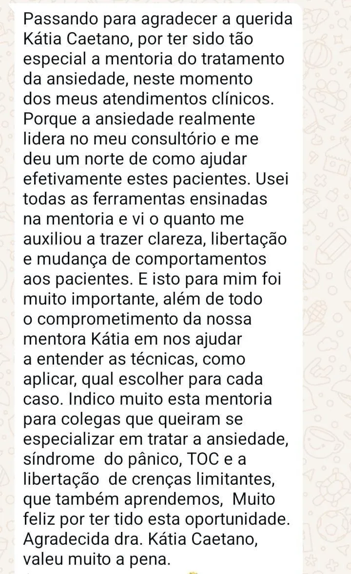 Durante 6 meses, você participa de encontros semanais em grupo reduzido, com análise de casos, feedback contínuo e orientação direta da Dra. Kátia, pós-doutora em TCC.